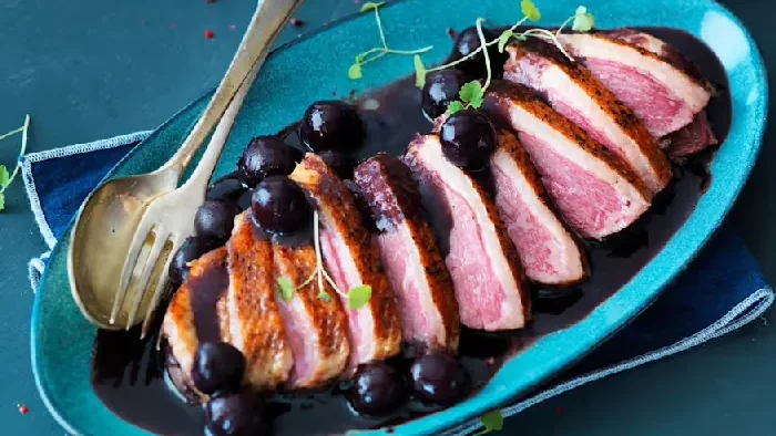- Cerejas e Frutas Vermelhas: Molhos de cereja com brandy ou reduções de framboesa são comuns, proporcionando uma cor vibrante e uma acidez aguda que contrasta com a riqueza da carne.